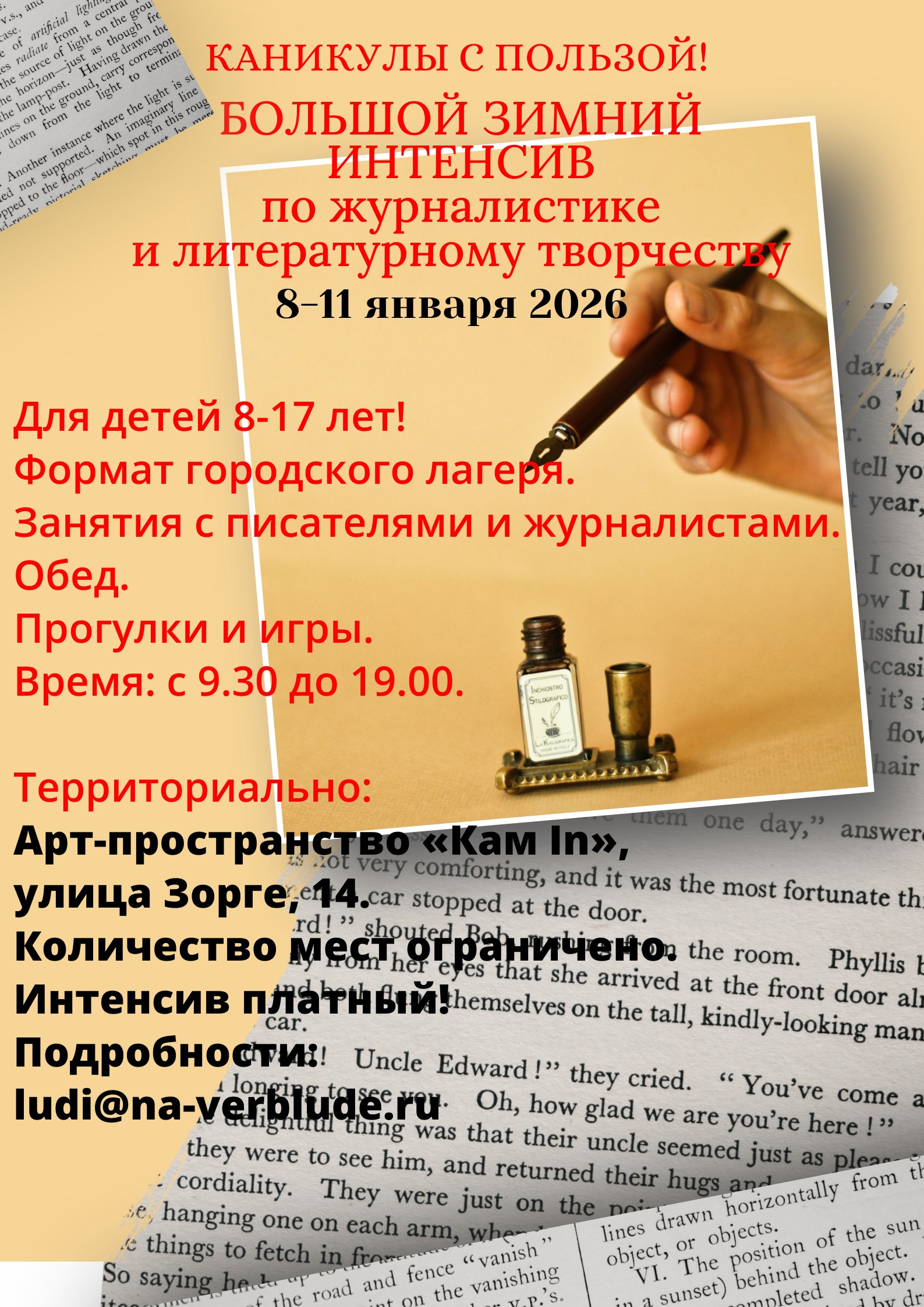 Дорогие друзья! Творческое объединение детей и взрослых «Люди на верблюде» при поддержке и содействии Союза журналистов России и Союза писателей Москвы приглашает принять участие в Большом Зимнем Интенсиве по журналистике и литературному творчеству! Желающие, пишите нам!